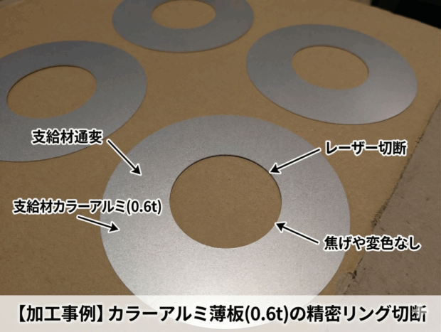 お客様より「0.6mm厚のカラーアルミ板からリング形状を切り出してほしい」とのご依頼をいただきました。